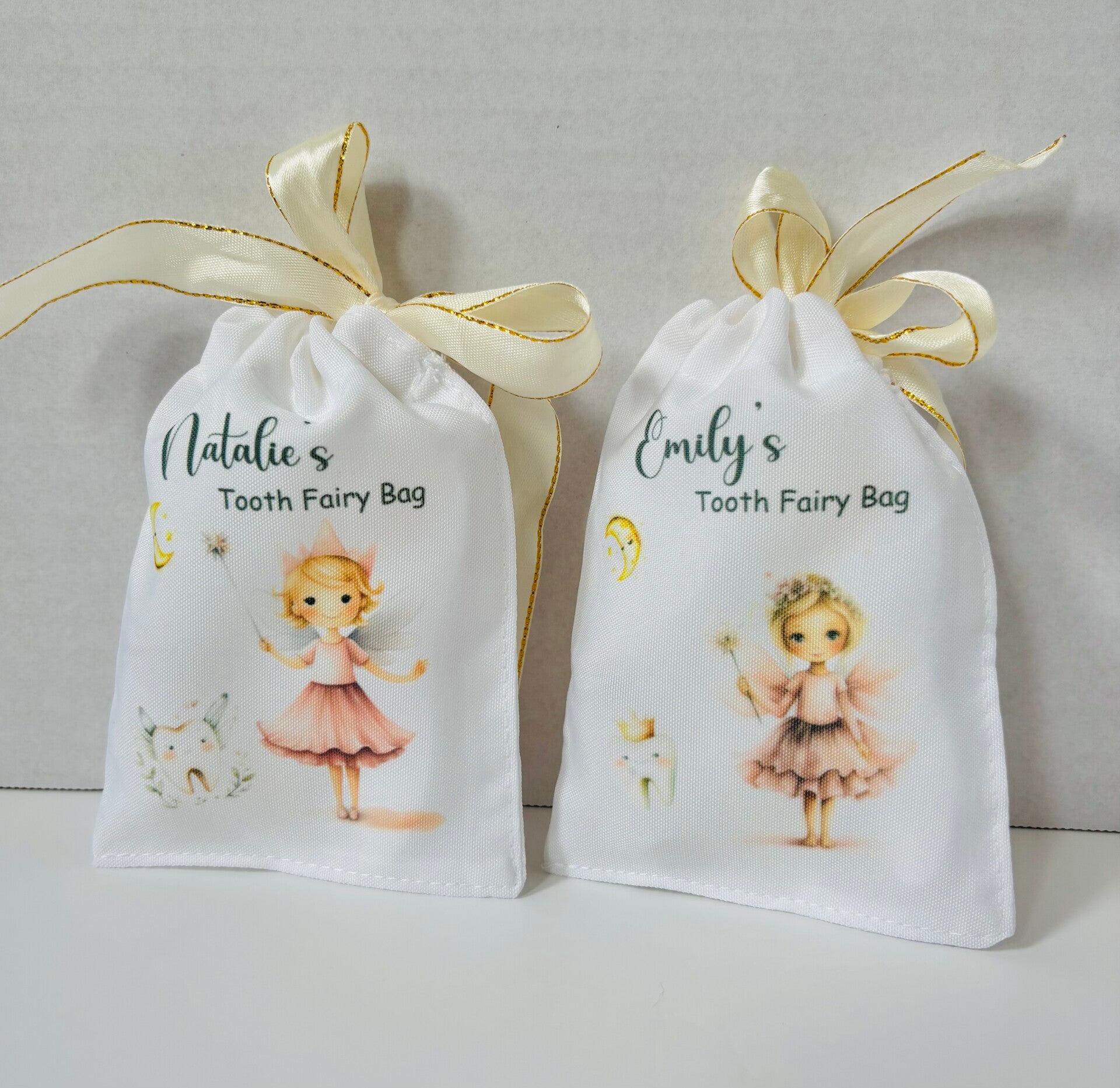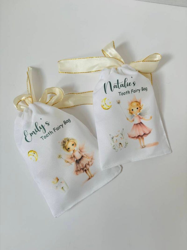Personalised Tooth Fairy Polyester bag, add Name and Fairy Design of your choice (Please check photos for more information), Acrylic Coin holder and mini glass Bottle to keep the tooth safe till Fairy arrives! Keep the magic alive with this beautifull keepsake and create memories your child will treasure forever