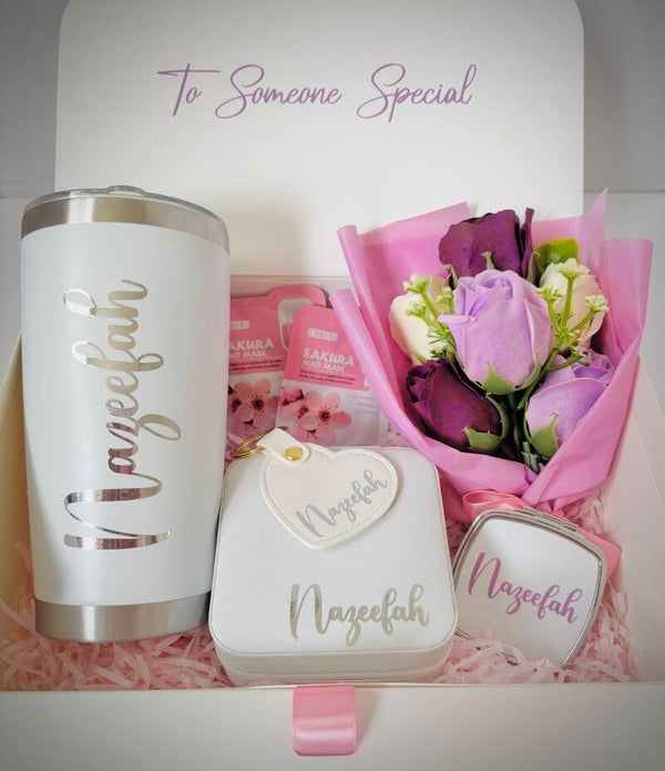Personalised White Box Pink Ribbon - 20oz Tumbler -Jewellerly Box - Soad Flower Bouquet - Pocket mirror - Keyring/Handbag Tag - 2x Mud mask